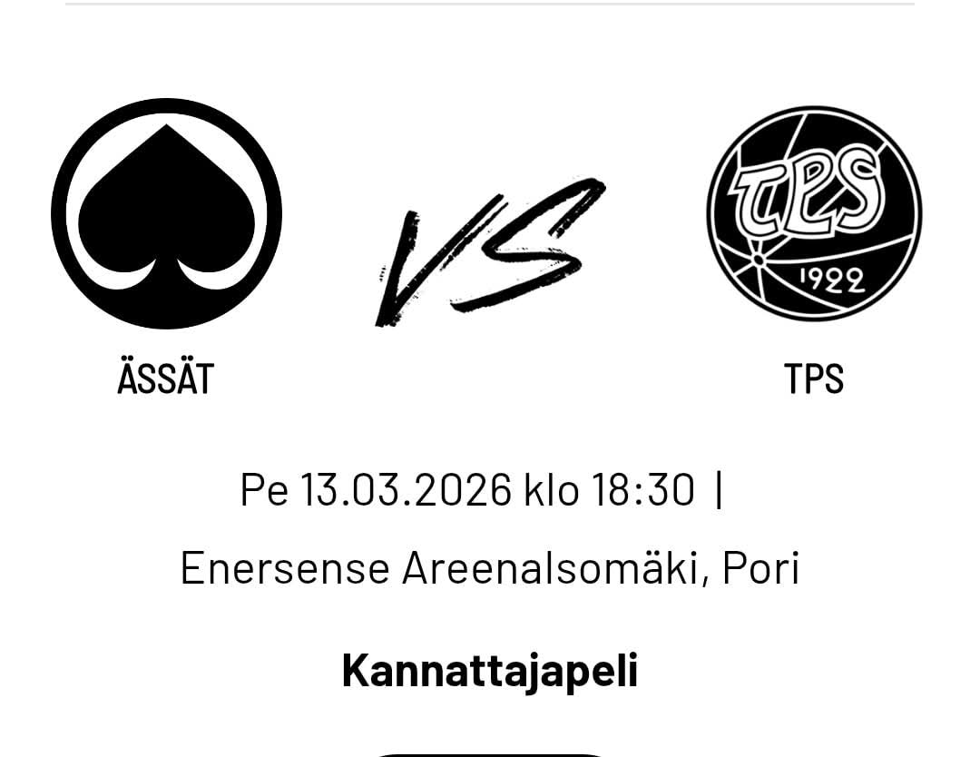 Jääkiekko-ottelu Ässät-TPS pe 13.3.2026 Porissa