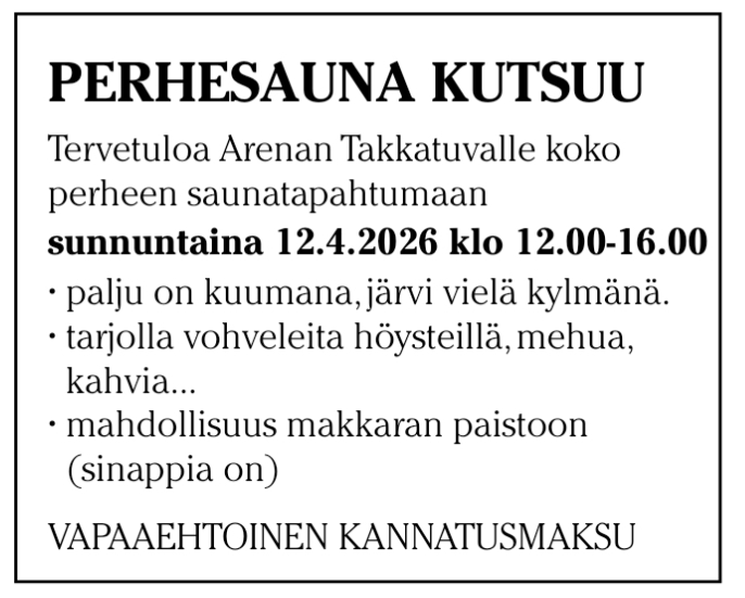Lännen kyläyhdistys » Ajankohtaista » Perhesauna Arenalla su 12.4. klo 12-16 Perhesauna Arenalla su 12.4. klo 12-16 7.4.2026 Jaa kaverille: Share on Facebook(Avautuu uudessa ikkunassa) Facebook Share on X(Avautuu uudessa ikkunassa) X Share on WhatsApp(Avautuu uudessa ikkunassa) WhatsApp ← Pääsiäispupu ollut liikenteessäRantojen siivouspäivä to 23.4. →